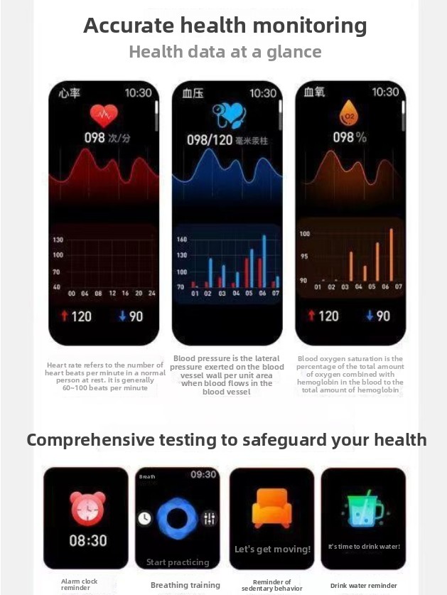 Multi-functional: Includes step counting, Bluetooth calls, remote selfie, and blood oxygen detection.